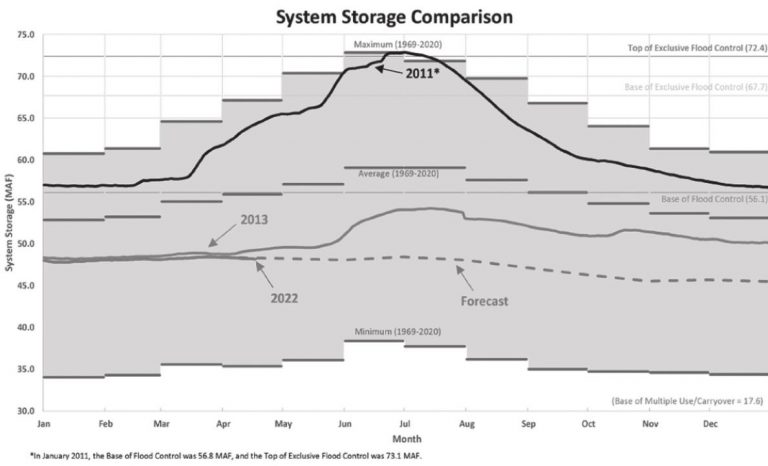 Dry conditions in April resulted in well-below average runoff in the upper Missouri River Basin. April runoff was 1.5 million acre-feet, which is 51 percent of average. The updated 2022 upper Basin runoff forecast is 17.8 MAF, 69 percent of average, which, if realized, would rank as the 23rd lowest calendar year runoff volume.