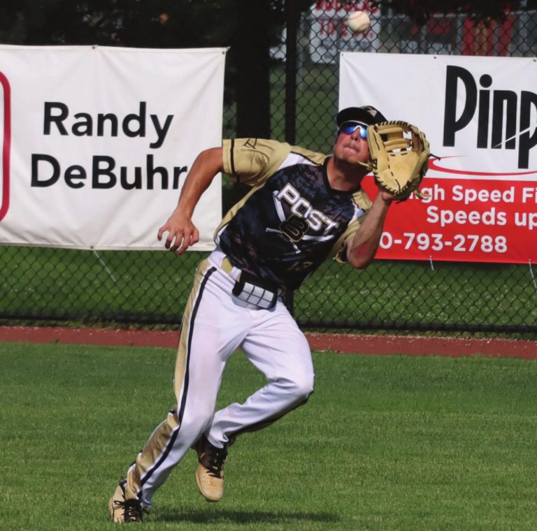 Cameron Elshire fields a ball in right field during the Nebraska City Modern Real Estate Senior game against Syracuse on June 18. Catch up on all the Legion action on the sports page. Photo by Kirt Manion