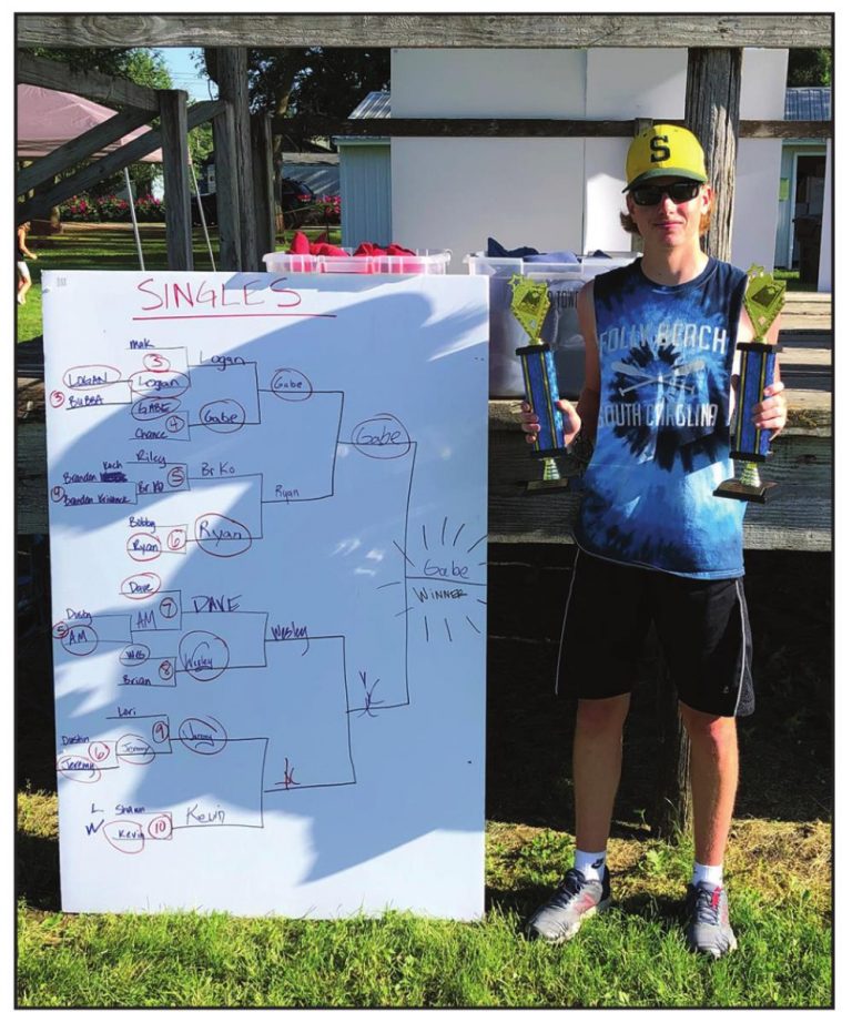 Gabe Dilley and Logan Zoller (aka “the young guns”) were doubles champions of the Second Annual Cornhole Tournament in Otoe Saturday, June 4. When the rain cleared, there were 24 teams in the tournament competing for the $500 first place prize. All together around 100 people attended to support the fundraiser.