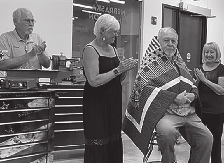 Jim Young was wrapped in gratitude and honor for the many lives he’s touched — including hundreds of veterans — when he received a Quilt of Valor during a presentation July 29 at the University of Nebraska–Lincoln’s Nebraska Innovation Studio.